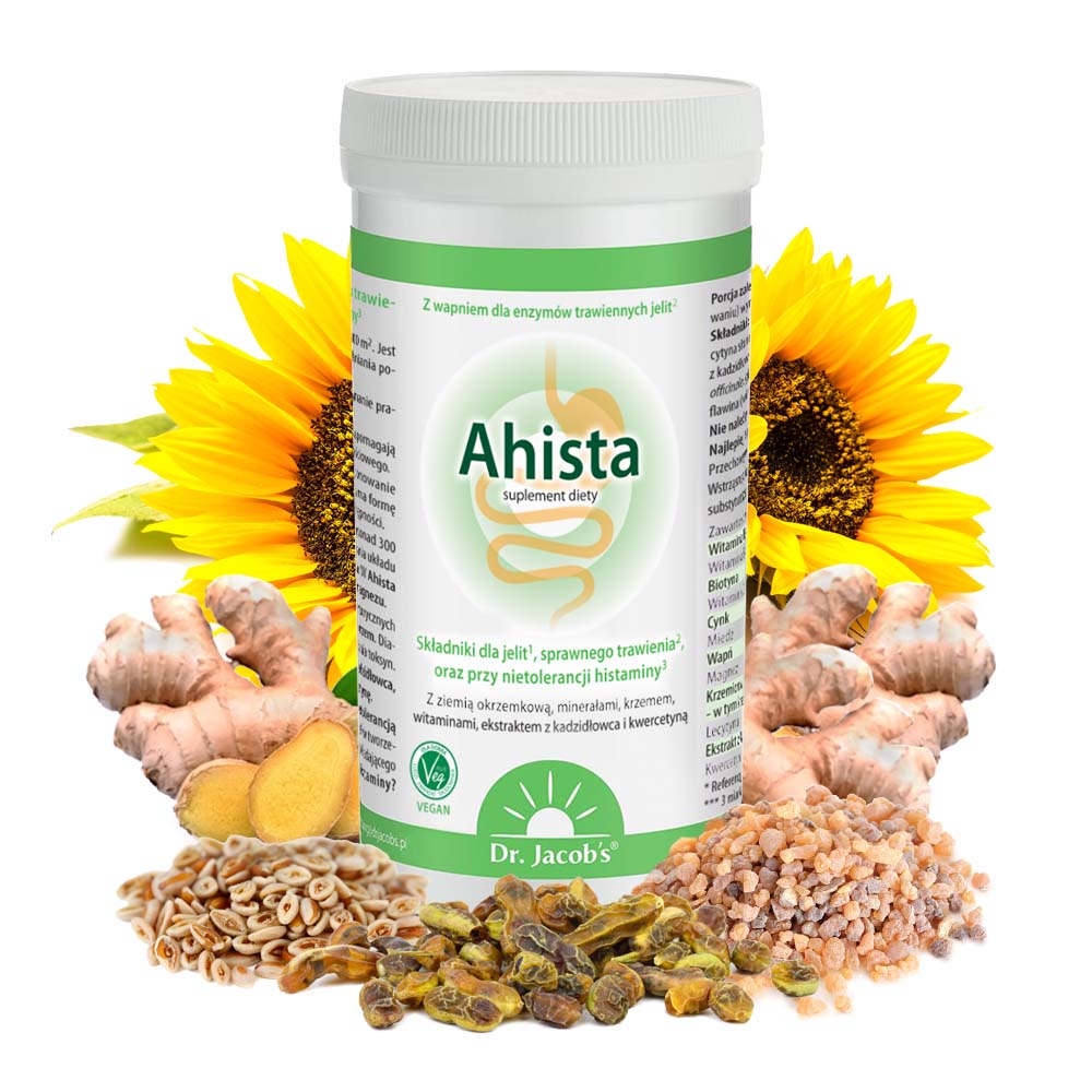Ahista to produkt ze składnikami dla odżywienia i prawidłowego funkcjonowania błony śluzowej jelit 1 oraz sprawnego trawienia 2. Zawierający też składniki dla sprawnego trawienia oraz hamowania niekorzystnego działania histaminy (więcej o histaminie pod opisem produktu).