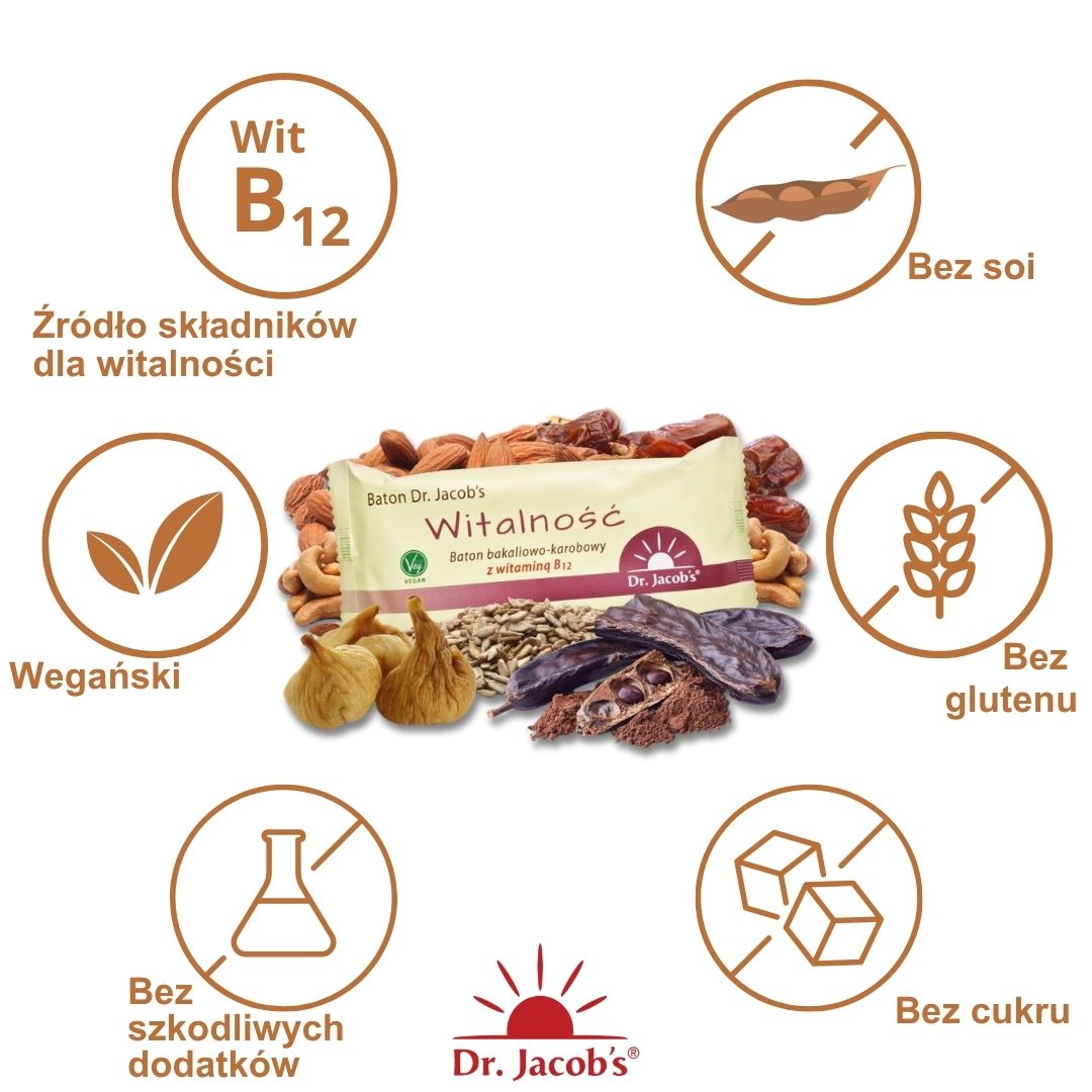 Baton Dr. Jacob's Witalność to pyszna mieszanka bakalii i karobu wzbogacona witaminą B12.