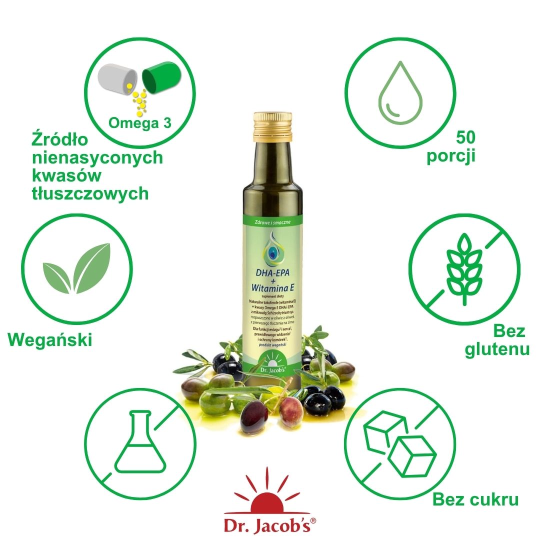5 ml produktu DHA-EPA + Witamina E zawiera ok. 90 mg naturalnych tokoferoli (witamina E). W przeliczeniu na ekwiwalent witaminy E daje to ok. 36 mg witaminy E. Witamina E (mieszanka tokoferoli) chroni komórki przed stresem oksydacyjnym – działaniem wolnych rodników tlenowych, które są jedną z głównych przyczyn starzenia się komórek.