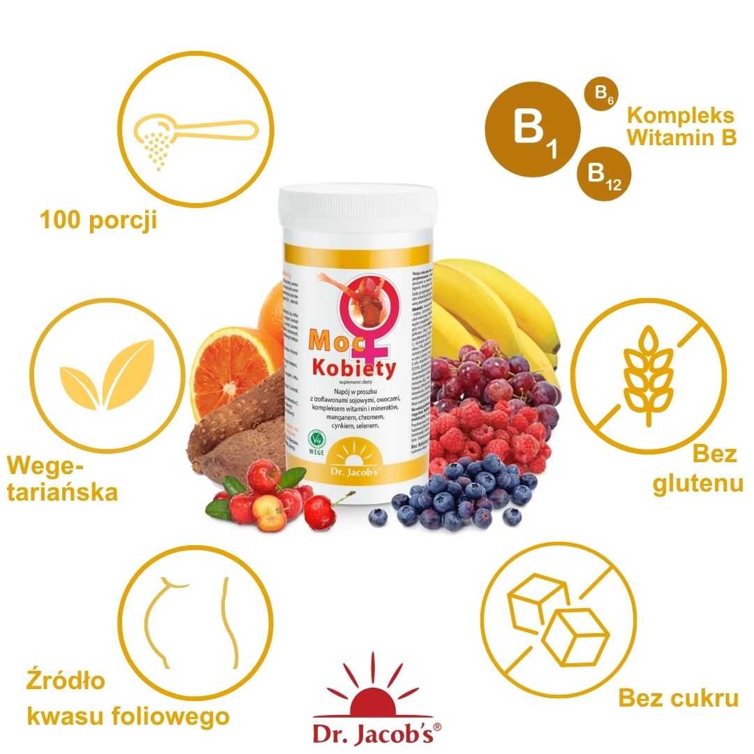 Moc Kobiety to proszek do sporządzenia koktajlu zawierającego to, co najbardziej potrzebne organizmowi dojrzałej kobiety. Fitohormony, witaminy i bogactwo substancji z jagód i owoców pozwalają jak najdłużej zachować pełnię kobiecości. Wegetariańskie, pełnowartościowe, lekkie.