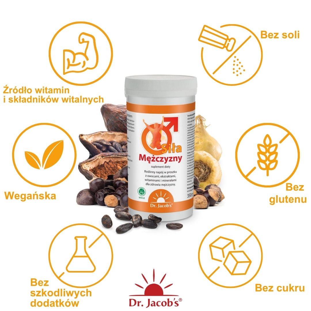 Napój w proszku z kakao, macą, owocami, witaminami oraz minerałami dla dojrzałego mężczyzny.