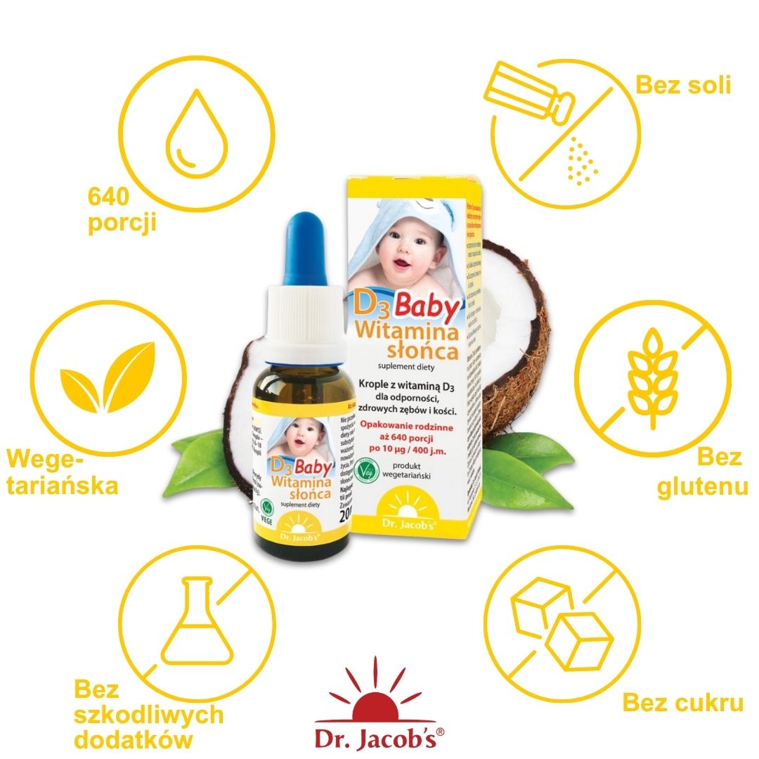 Witamina słońca D3 Baby Dr. Jacob's to produkt z najwyższej jakości witaminą D3 już rozpuszczoną w hipoalergicznym oleju MCT.